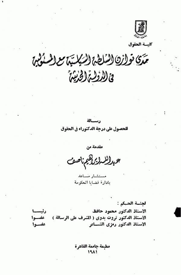 مدى توازن السلطة السياسية مع المسئولية في الدولة الحديثة / إعداد عبد الله إبراهيم ناصف ؛ إشراف ثروت بدوي.