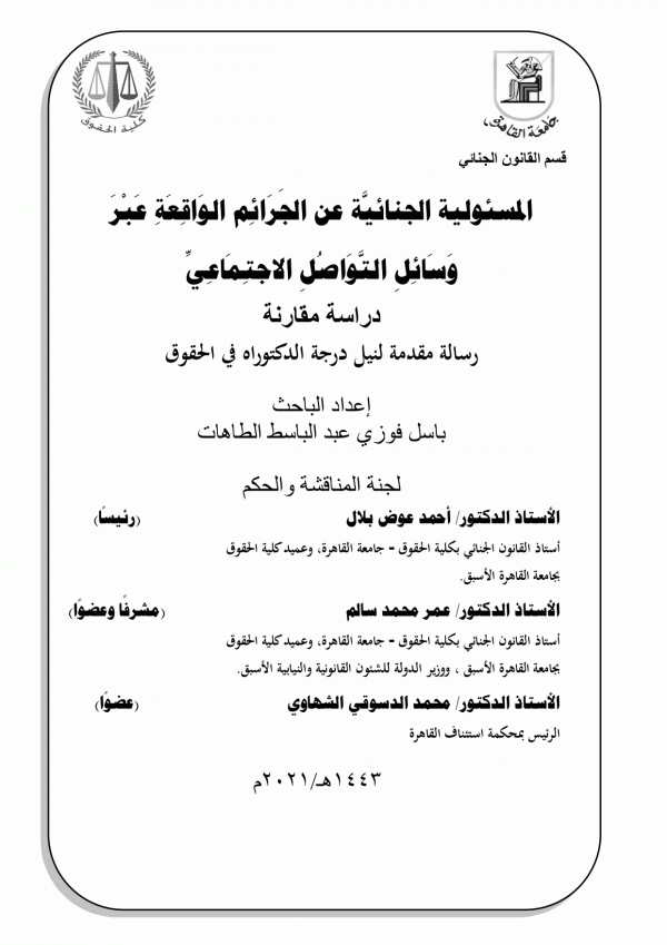 المسئولية الجنائية عن الجرائم الواقعة عبر وسائل التواصل الاجتماعي : دراسة مقارنة / إعداد باسل فوزي عبد الباسط الطاهات ؛ إشراف الأستاذ الدكتور أحمد عوض بلال.