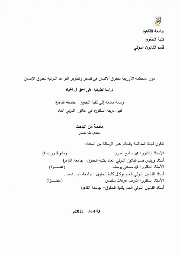 دور المحكمة الأوروبية لحقوق الإنسان في تفسير وتطوير القواعد الدولية لحقوق الإنسان: دراسة تطبيقية على الحق في الحياة/ مجدي طه حسن