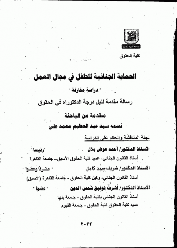 الحماية الجنائية للطفل فى مجال العمل : دراسة مقارنة / إعداد نسمة سيد عبد العظيم محمد علي ؛ إشراف الأستاذ الدكتور شريف سيد كامل.