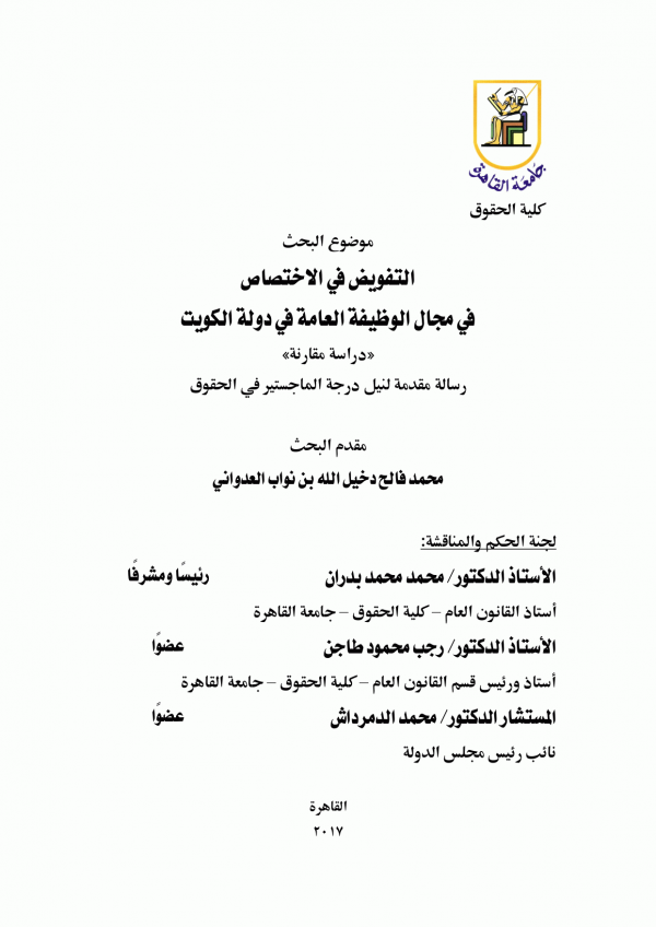 التفويض فى الاختصاص فى مجال الوظيفة العامة فى دولة الكويت : دراسة مقارنة / إعداد محمد فالح دخيل الله بن نواب العدواني ؛ إشراف الأستاذ الدكتور محمد محمد بدران .