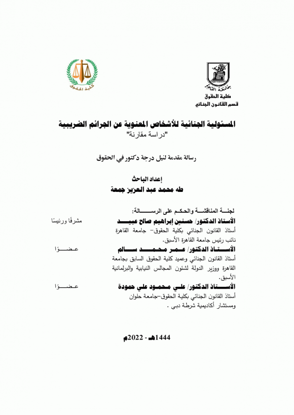 المسئولية الجنائية للأشخاص المعنوية عن الجرائم الضريبية : "دراسة مقارنة" / إعداد طه محمد عبد العزيز جمعة ؛ إشراف حسنين إبراهيم صالح عبيد