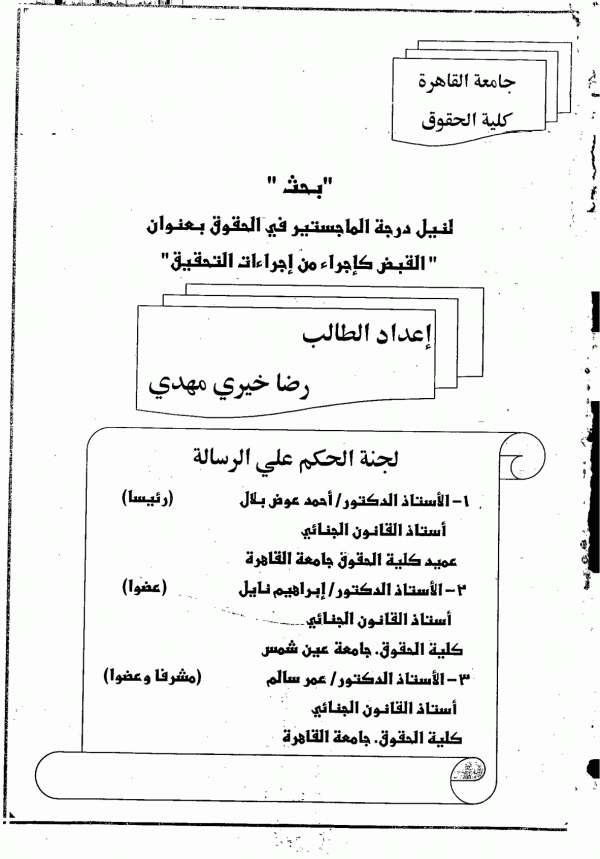 القبض كاجراء من اجراءات التحقيق / رضا خيرى مهدى ؛ اشراف عمر سالم
