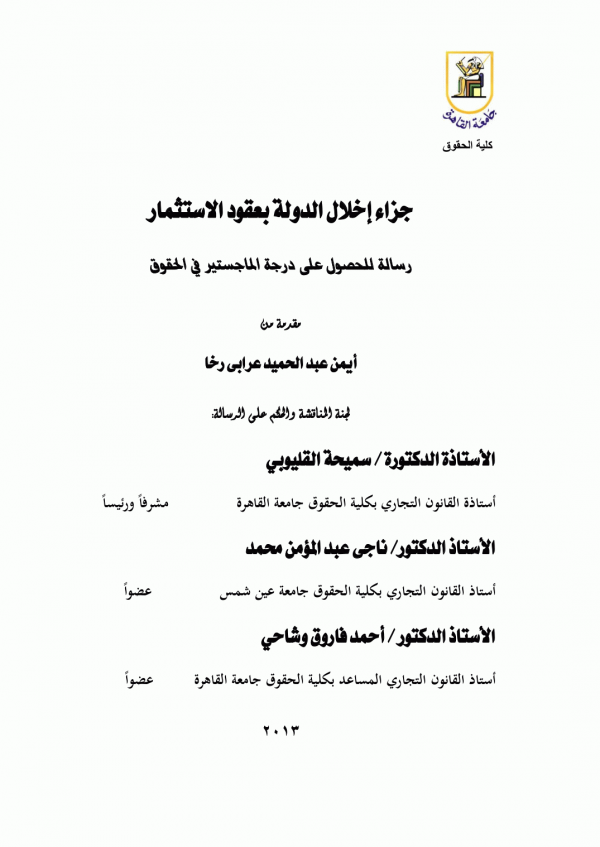 جزاء إخلال الدولة بعقود الاستثمار \ إعداد أيمن عبدالحميد عرابي رخا ؛ إشراف الأستاذة الدكتورة \سميحة القليوبي