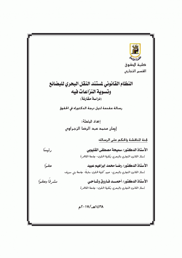 النظام القانوني لمستند النقل البحري للبضائع و تسوية النزاعات فيه : دراسة مقارنة / إعداد إيمان محمد عبدالرضا الزجراوي ؛ اشراف الأستاذه الدكتوره / سميحة القليوبي