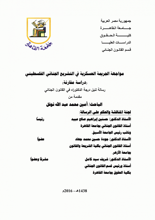 مواجهة الجريمة العسكرية في التشريع الجنائي الفلسطيني : دراسة مقارنة/ اعداد : أمين محمد عبدالله نوفل ؛ اشراف : حسنين إبراهيم صالح عبيد