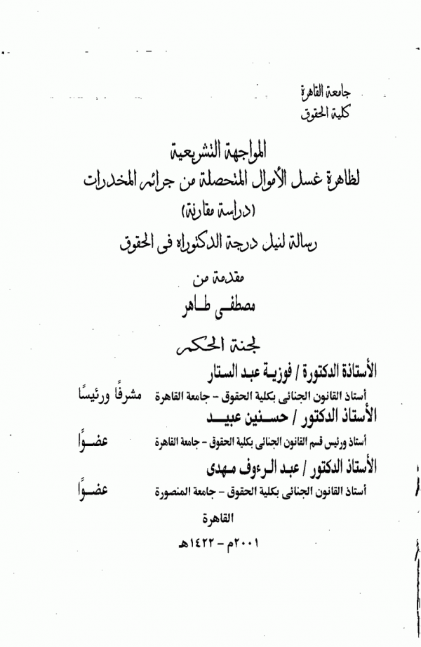 المواجهة التشريعية لظاهرة غسل الأموال المتحصلة من جرائم المخدرات : دراسة مقارنة / إعداد مصطفى طاهر ؛ إشراف الأستاذة الدكتور فوزية عبد الستار.