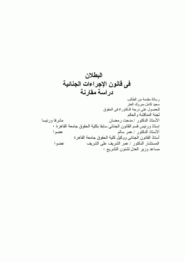 البطلان في قانون الإجراءات الجنائية : دراسة مقارنة / اعداد: سعيد كامل العتر؛ اشراف: الأستاذ الدكتور: مدحت رمضان