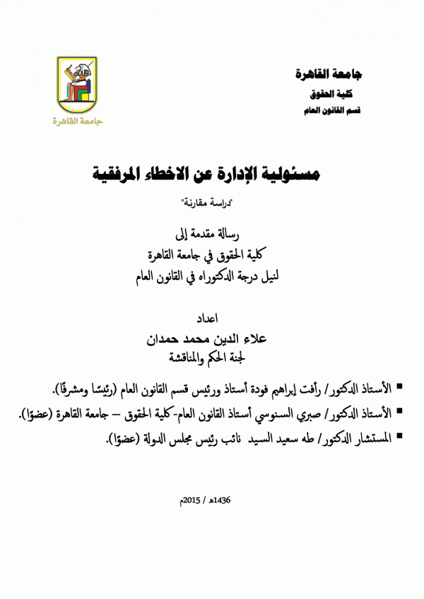مسئولية الإدارة عن الاخطاء المرفقية : دراسة مقارنة / اعداد: علاء الدين محمد حمدان ؛ اشراف الأستاذ الدكتور رأفت ابراهيم فوده