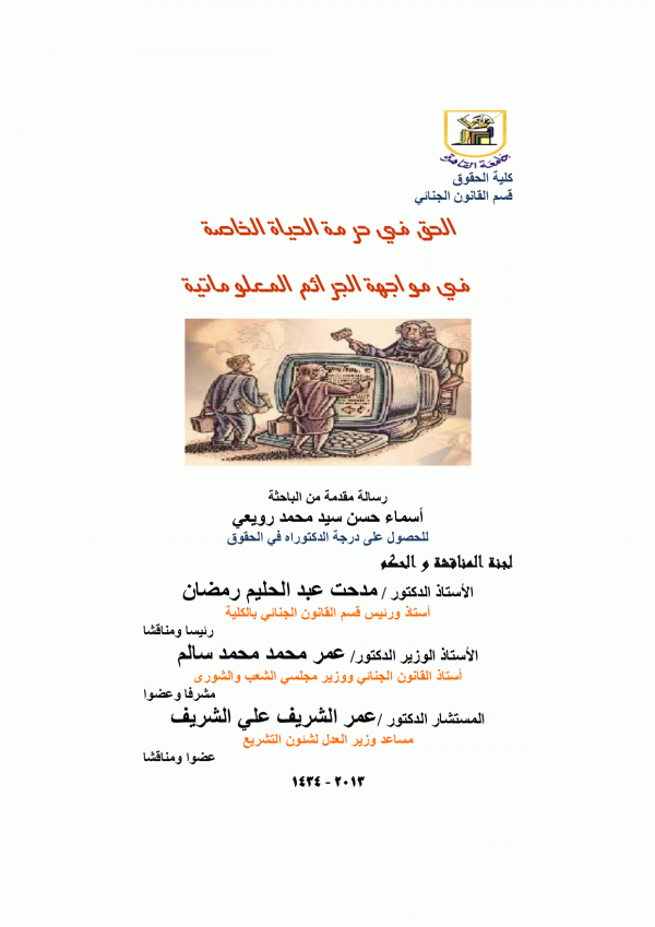 الحق في حرمة الحياة الخاصة في مواجهة الجرائم المعلوماتية / اعداد: أسماء حسن سيد محمد رويعي ؛ اشراف : الأستاذ الدكتور الوزير / عمر محمد محمد سالم