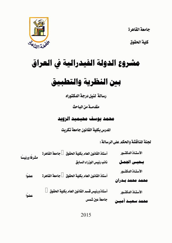 مشروع الدولة الفيدرالية فى العراق بين النظرية والتطبيق / اعداد: محمد يوسف ميحيمد الزويد ؛ اشراف : الأستاذ الدكتور/ يحيى الجمل