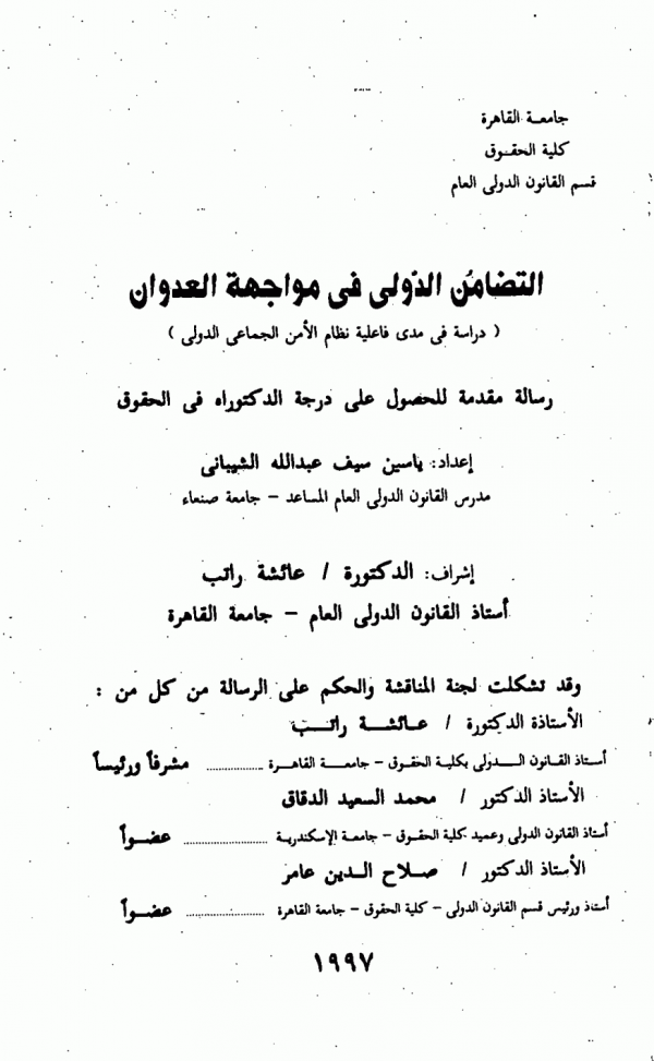 التضامن الدولى فى مواجهة العدوان : دراسة فى مدى فاعلية نظام الأمن الجماعى الدولى / اعداد: ياسين سيف عبدالله الشيبانى ؛ اشراف : الأستاذة الدكتورة /عائشة راتب