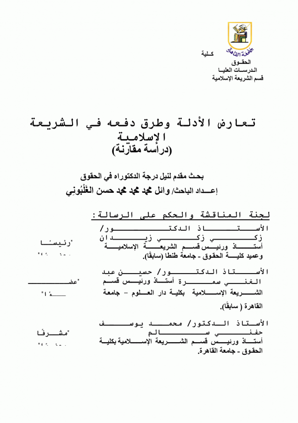 تعارض الأدلة وطرق دفعه في الشريعة الإسلامية : دراسة مقارنة / إعداد وائل محمد محمد محمد حسن الغلبوني ؛ إشراف محمد يوسف حفني سالم