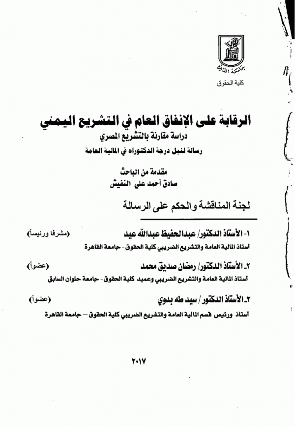 الرقابة علي الانفاق العام فى التشريع اليمني : دراسة مقارنة بالتشريع المصرى / اعداد: صادق احمد على النفيش ؛ اشراف عبدالحفيظ عبدالله عيد