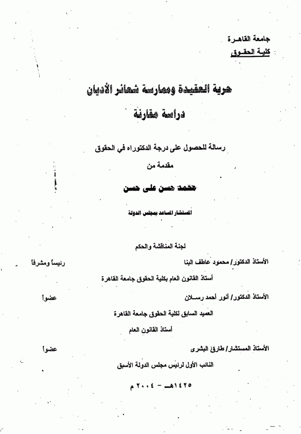 حرية العقيدة وممارسة شعائر الأديان : دراسة مقارنة / اعداد: محمد حسن على حسن ؛ اشراف: الأستاذ الدكتور/ محمود عاطف البنا