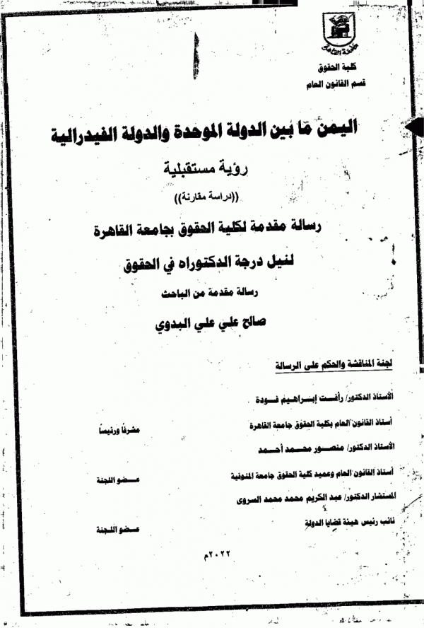 This thesis comes primarily to defend Yemeni unity, by adopting the administrative and political decentralization system - the federal system - after the failure of the central system to preserve it. It also aims to find a logical solution to get out of the state of political tyranny and instability that Yemen has suffered and is still suffering from, by dividing power and distributing wealth, because of which Yemenis have been in constant conflict. In addition, this message came to reach a logical and practical vision to end the raging civil war, find a just political settlement that guarantees the country a safe exit, and puts Yemenis on the right path to building the new, unified Yemen they aspire to, and the establishment of their state based on justice, democracy, freedom and equality under the regime. And the law.