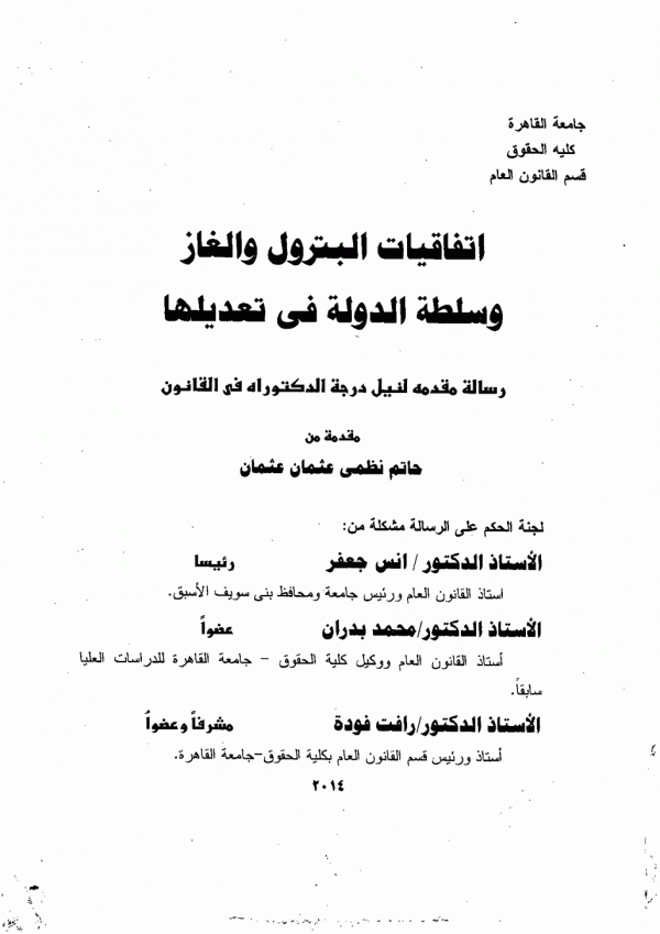 اتفاقيات البترول والغاز وسلطة الدولة في تعديلها / اعداد: حاتم نظمي عثمان عثمان ، اشراف: الأستاذ الدكتور/ رأفت فودة
