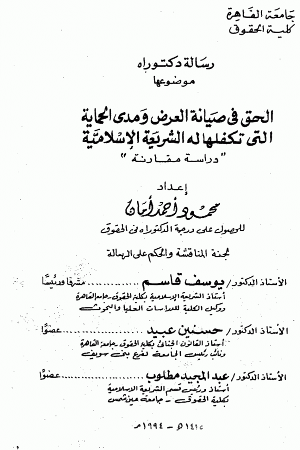أطروحة (دكتوراه)-جامعة القاهرة ، كلية الحقوق، قسم الشريعة الإسلامية 1994