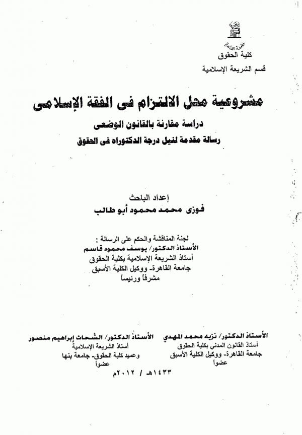 مشروعية محل الالتزام فى الفقه الاسلامى : دراسة مقارنة بالقانون الوضعي/ فوزى محمد محمود أبو طالب