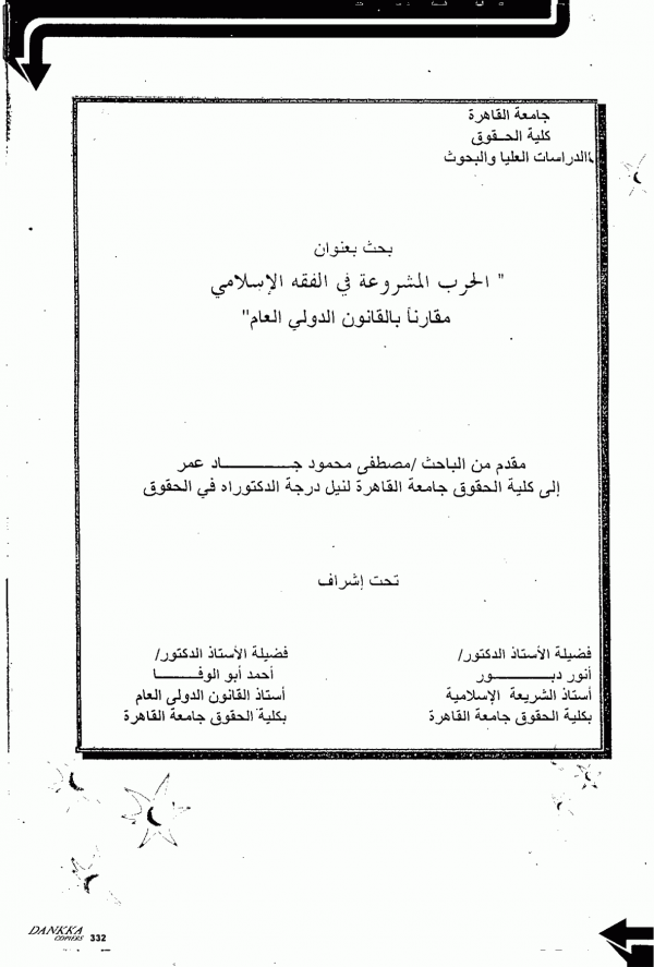 الحرب المشروعة فى الفقه الاسلامى : دراسة مقارنة / اعداد: مصطفى محمود جاد عمر ؛ اشراف: الأستاذ الدكتور / انور دبور - احمد ابو الوفا