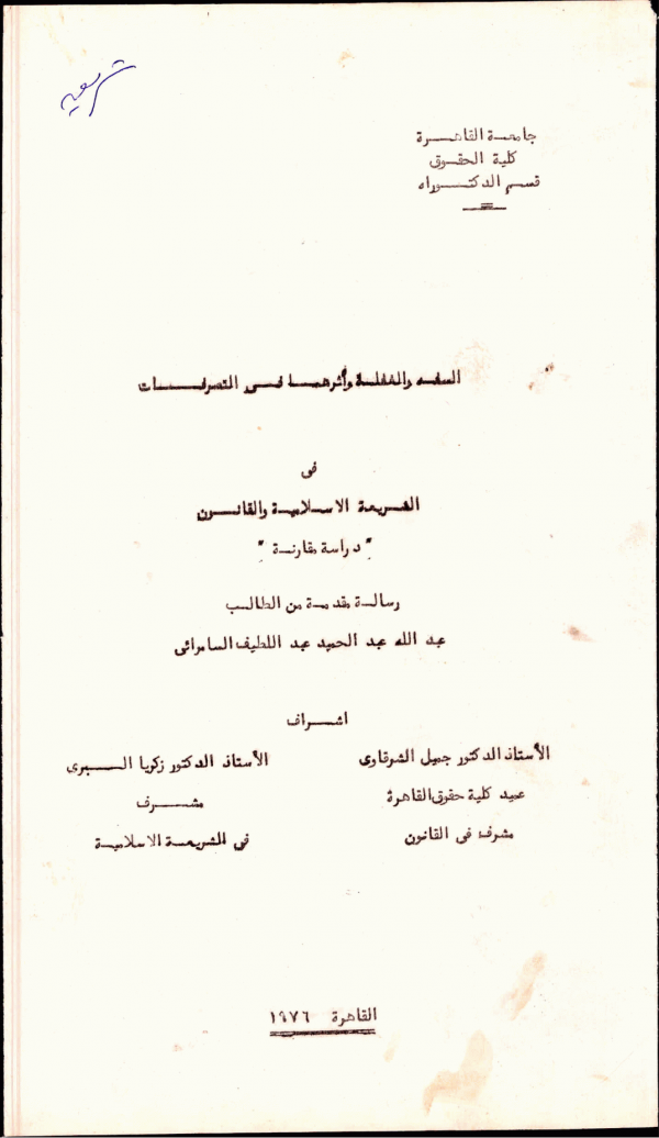 أطروحة (دكتوراه)-جامعة القاهرة، كلية الحقوق، قسم الشريعة الإسلامية 1976.