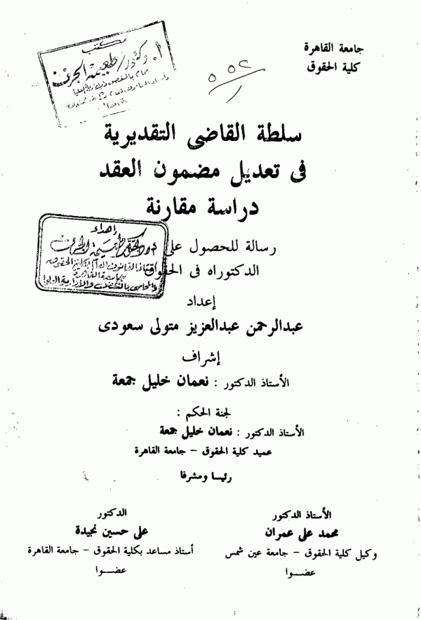 سلطة القاضى التقديرية فى تعديل مضمون العقد : دراسة مقارنة / اعداد عبدالرحمن عبدالعزيز متولي سعودي ؛ اشراف نعمان خليل جمعة