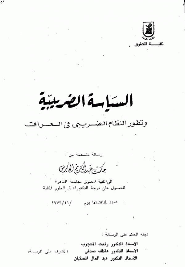 السياسة الضريبية : وتطور النظام الضريبي في العراق / إعداد حكمت عبد الكريم الحارس ؛ إشراف الأستاذ الدكتور عاطف صدقي.
