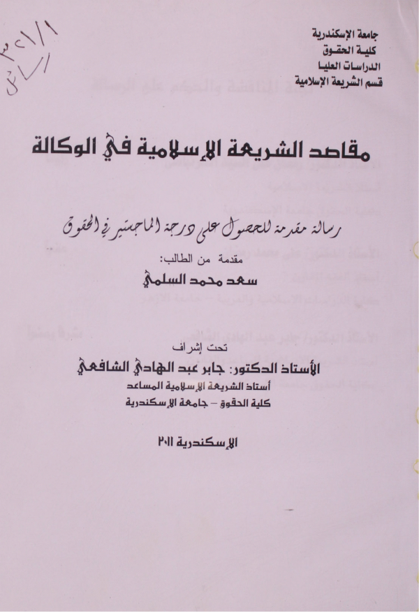 مقاصد الشريعة الاسلامية فى الوكالة / اعداد: سعد محمد السلمى ؛ اشراف: جابر عبدالهادى الشافعى