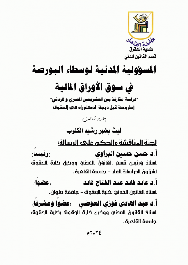المسؤولية المدنية لوسطاء البورصة في سوق الأوراق المالية : دراسة مقارنة بين التشريعين المصري والأردني / إعداد ليث بشير رشيد الكلوب؛ إشراف عبدالهادي فوزي العوضي