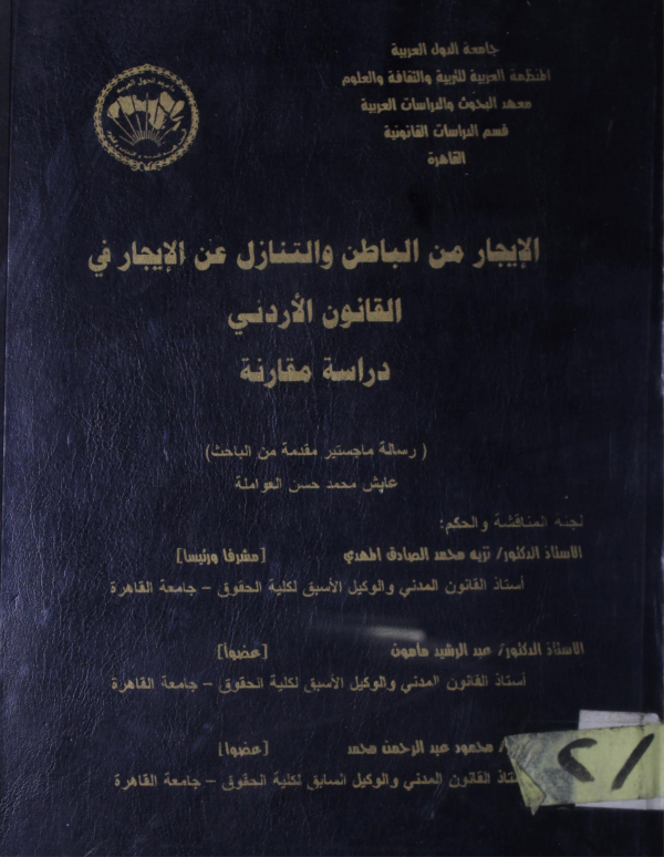 الايجار من الباطن والتنازل عن الايجار فى القانون الاردني / دراسة مقارنة / إعداد عايش محمد حسن العواملة ؛ إشراف نزيه محمد الصادق المهدى