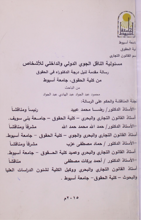 أطروحة (دكتوراه)-جامعة أسيوط، كلية الحقوق، قسم القانون التجاري 2015