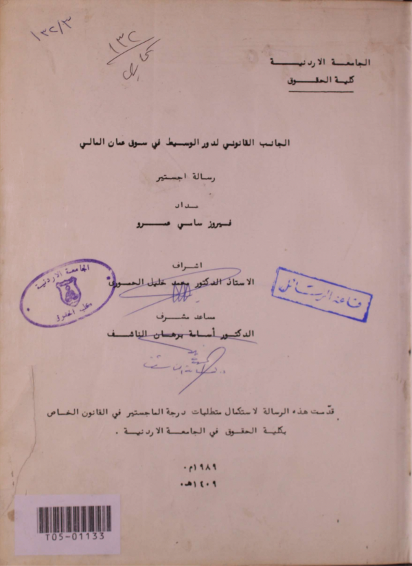 الجانب القانونى لدور الوسيط فى سوق عمان المالي / إعداد فيروز سامى عمرو ؛ إشراف محمد خليل الحمورى