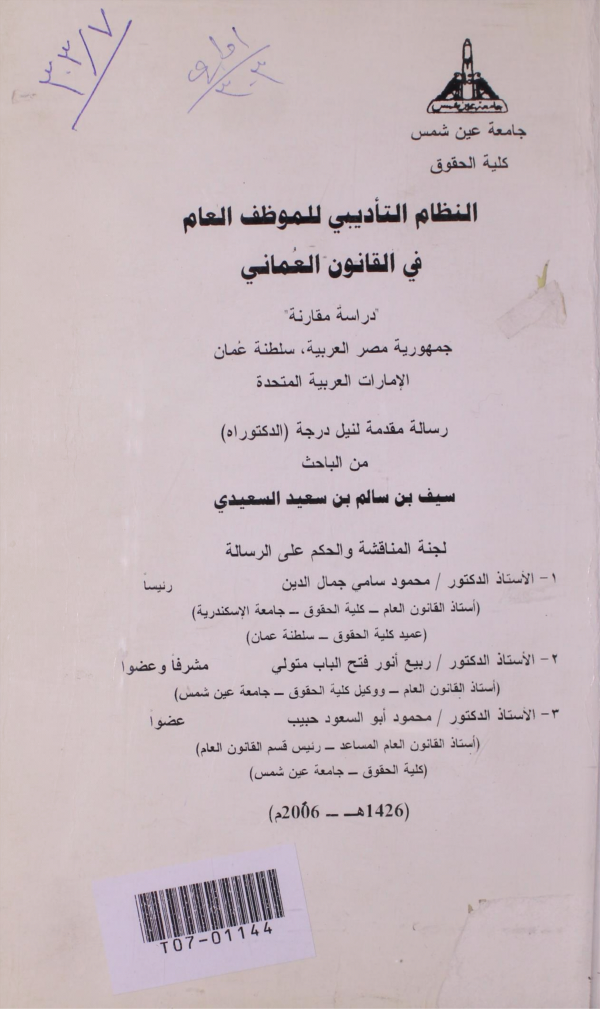 النظام التأديبى للموظف العام فى القانون العمانى : دراسة مقارنة - جمهورية مصر العربية - سلطنة عمان - الامارات العربية المتحدة / إعداد سيف بن سالم بن سعيد السعيدى ؛ إشراف ربيع أنور فتح الباب متولى