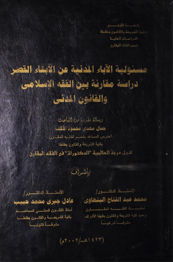مسئولية الاباء المدنية عن الابناء القصر : دراسة مقارنة بين الفقه الاسلامى والقانون المدني / إعداد جمال مهدى محمود الاكشة؛ إشراف محمد عبدالفتاح البنهاوي