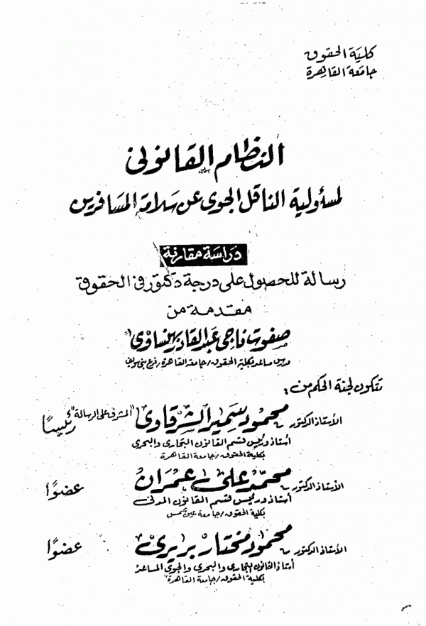 النظام القانوني لمسئولية الناقل الجوي عن سلامة المسافرين : دراسة مقارنة / إعداد صفوت ناجي عبد القادر بهنساوى ؛ إشراف محمود سمير الشرقاوي