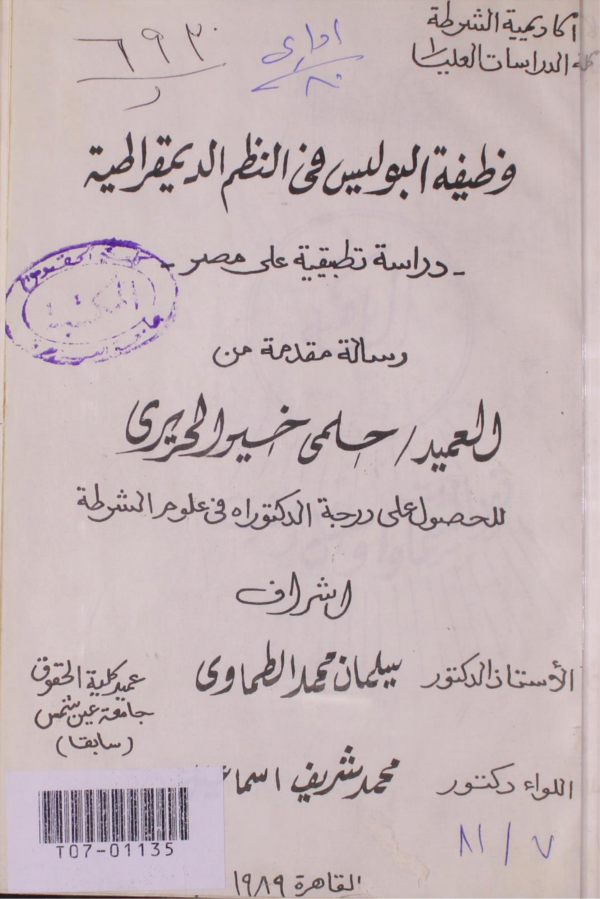 أطروحة (دكتوراه)-أكاديمية الشرطة، كلية الدراسات العليا، قسم القانون العام 1989