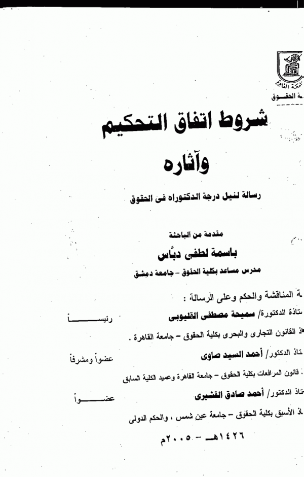 شروط اتفاق التحكيم واثاره / اعداد: باسمة لطفى دباس ؛ اشراف: الأستاذ الدكتور/ احمد السيد صاوى