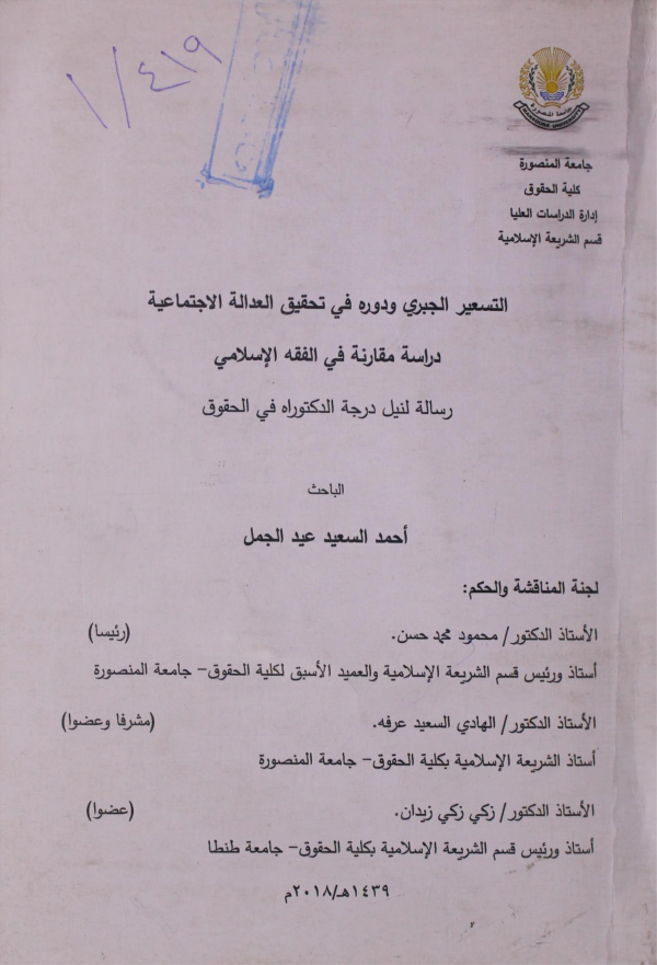 التسعير الجبري ودوره في تحقيق العدالة الاجتماعية : دراسة مقارنة في الفقه الإسلامي / إعداد أحمد السعيد عيد الجمل؛ إشراف الهادي السعيد عرفه
