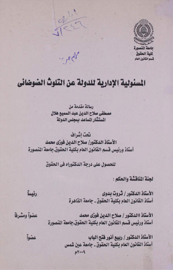Law1 07 PHD 2009 0701329 C1 التحكيم في العقود الإدارية بين التأييد والإعتراض : دراسة مقارنة بين مصر وفرنسا والمغرب / | Law1 07 PHD 2009 0701333 C1 التحكيم في المنازعات الإدارية وآثاره القانونية / | Law1 07 PHD 2009 0701336 C1 المسئـوليــة الـوزاريـــة في النظم الوضعية المعاصرة وفي النظم الإسلامية: دراسه مقارنه / | Law1 07 PHD 2009 0701337 C1 المسئولية الادارية للدولة عن التلوث الضوضائي / | Law1 07 PHD 2009 0701345 C1 مجالس التاديب ورقابة المحكمة الادارية العليا عليها / | Law1 07 PHD 2009 0701352 C1 حماية البيئة من التلوث فى القانون الادارى والفقه الاسلامى / دراسة مقارنة / | Law1 07 PHD 2009 0701372 C1 الجريمة التأديبية ودور الرقابة الإدارية / |