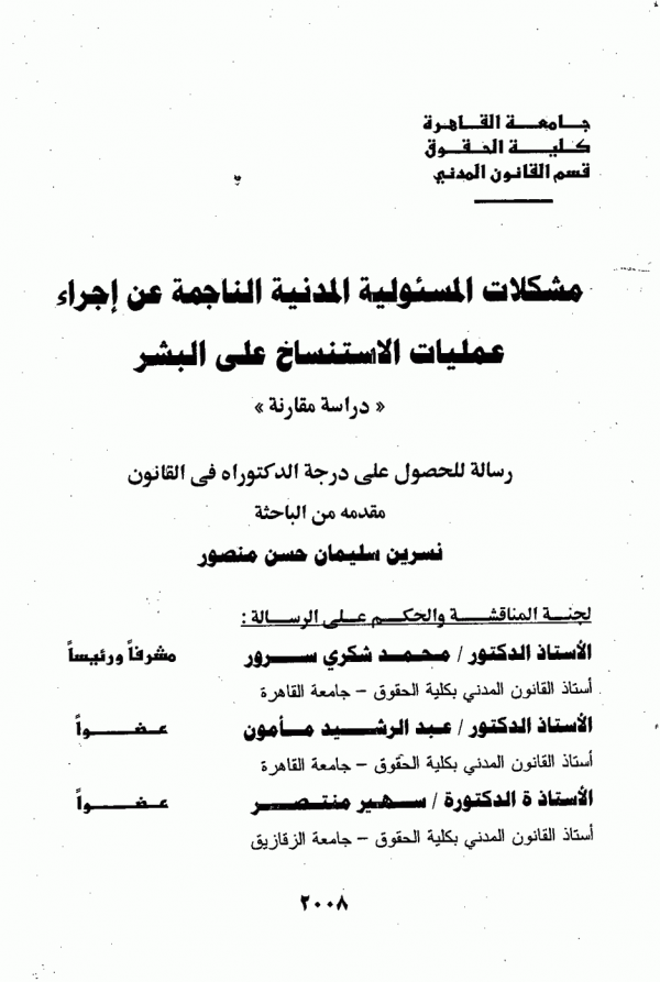 مشكلات المسئولية المدنية الناجمة عن اجراء عمليات الاستنساخ على البشر : دراسة مقارنة / نسرين سليمان حسن منصور