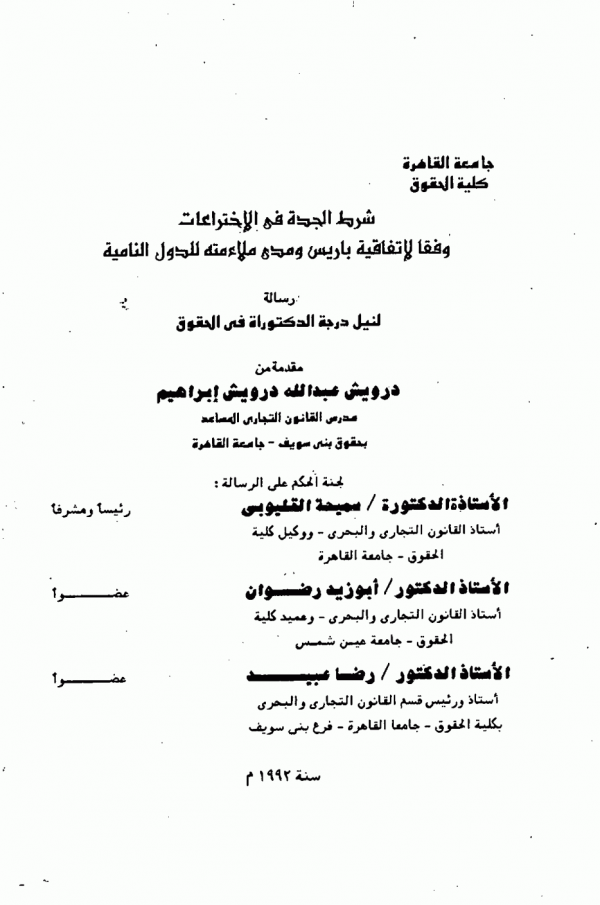 شرط الجدة فى الاختراعات وفقا لاتفاقية باريس ومدى ملاءمته للدول النامية / إعداد درويش عبدالله درويش إبراهيم .