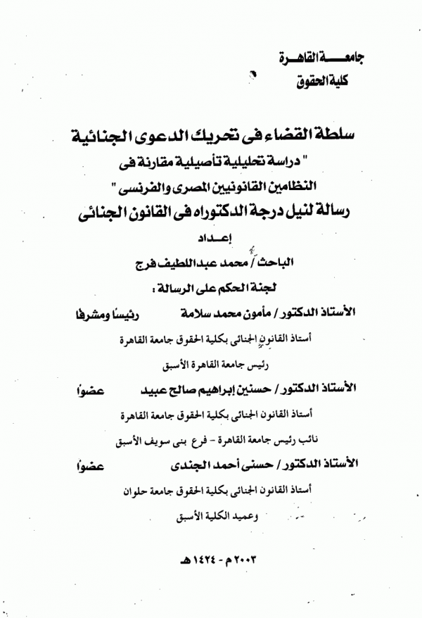 اطروحة (دكتوراه) - جامعة القاهرة - كلية الحقوق - قسم القانون الجنائى، 2003