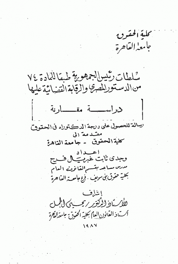 سلطات رئيس الجمهورية طبقا للمادة 74 من الدستور المصري والرقابة القضائية عليها : دراسة مقارنة مع المادة 16 من الدستور الفرنسي / وجدي ثابت غبريال فرج