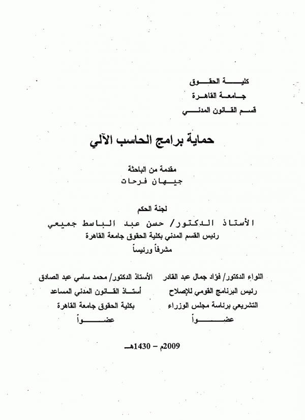 Law1 02 PHD 2008 0201200 C1 احكام تقدير التعويض واثر تغير القوة الشرائية للنقود على تقديره : دراسة مقارنة / | Law1 02 PHD 2008 0201835 C1 مشكلات المسئولية المدنية الناجمة عن اجراء عمليات الاستنساخ علي البشر / دراسة مقارنة / | Law1 02 PHD 2009 0200317 C1 حماية برامج الحاسب الالى / | Law1 02 PHD 2009 0200318 C2 حماية برامج الحاسب الالى / | Law1 02 PHD 2009 0200464 C1 الحماية القانونية الادبية والفنية فى التشريعين المصرى والاردنى : دراسة مقارنة / | Law1 02 PHD 2009 0200465 C2 الحماية القانونية الادبية والفنية فى التشريعين المصرى والاردنى : دراسة مقارنة / | Law1 02 PHD 2009 0200534 C1 دور الفسخ الاتفاقى فى انهاء العقود / |