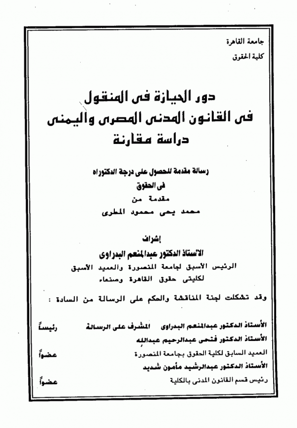 Dissertation note: اطروحة (دكتوراه) - جامعة القاهرة - كلية الحقوق - قسم القانون المدني 1986
