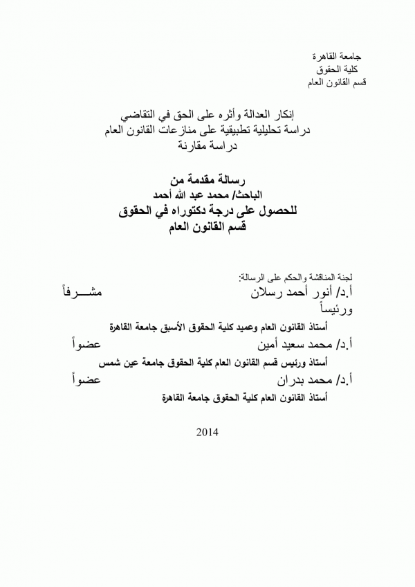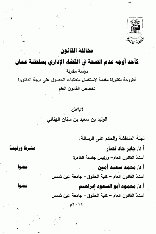 Dissertation note: أطروحة (ماجستير)-جامعة القاهرة-كلية الحقوق-قسم القانون العام، 2014