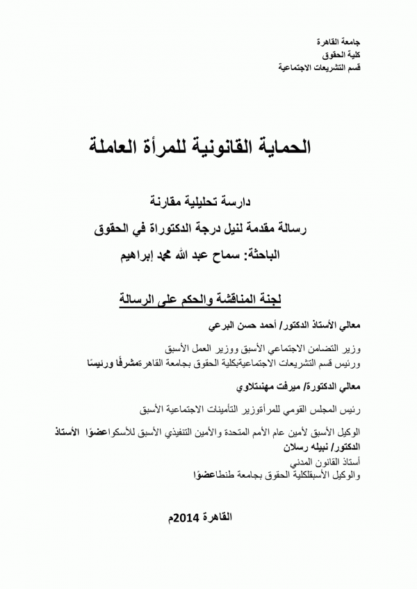 Dissertation note: اطروحة (دكتوراه) - جامعة القاهرة - كلية الحقوق - قسم التشريعات الاجتماعية، 2013