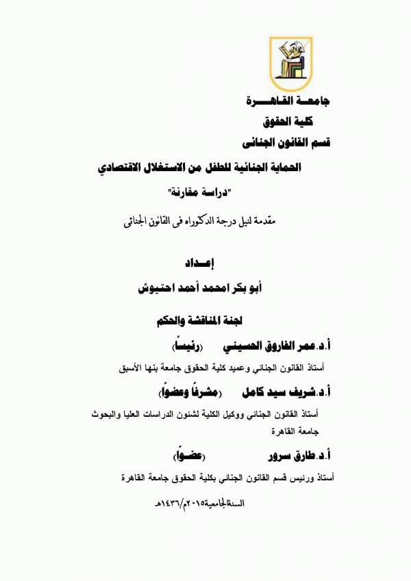 Dissertation note: اطروحة (دكتوراه) - جامعة القاهرة - كلية الحقوق - قسم القانون الجنائى، 2015