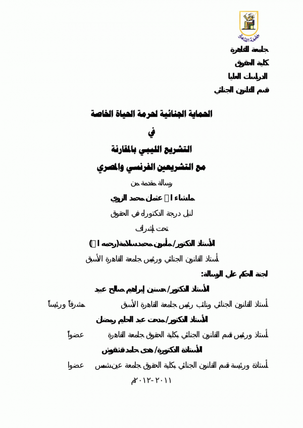 Dissertation note: أطروحة (دكتوراه) - جامعة القاهرة - كلية الحقوق - قسم القانون الجنائي 2017.