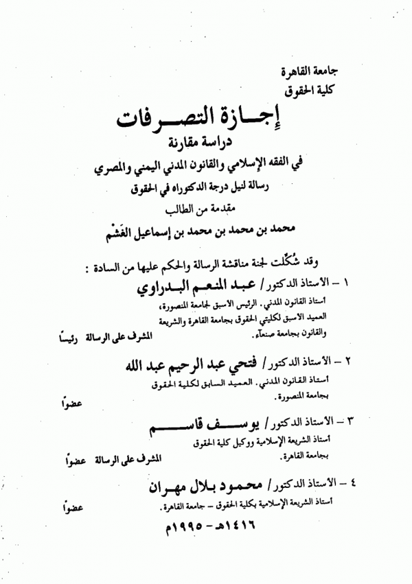 Dissertation note: اطروحة(دكتوراه) - جامعة القاهرة - كلية الحقوق - قسم القانون المدني، 1995
